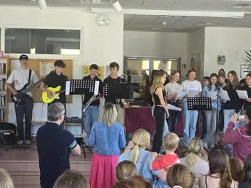 Ein zentraler Treffpunkt des Festes waren Aula und Pausenhof, wo mehrere Stände aufgebaut waren und die bewusst als Mittelpunkt der Veranstaltung gestaltet wurde. Hier spielte die Schulband, von dort aus konnten die Besucher das Schulhaus erkunden oder an Führungen teilnehmen, die Einblicke in das vielfältige schulische Angebot ermöglichten.